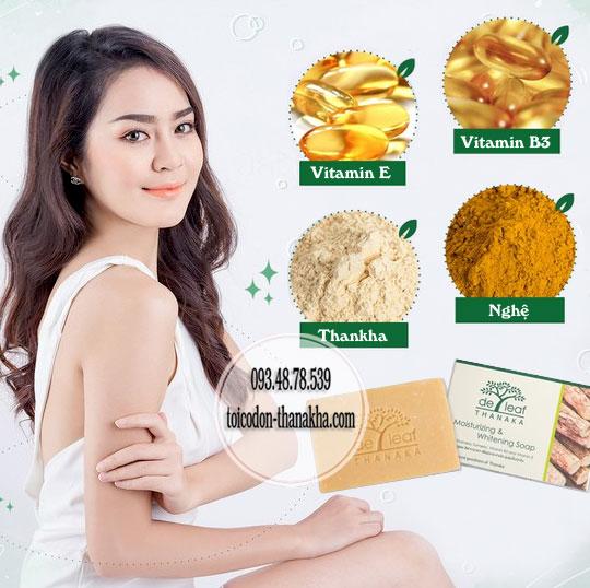 - Thành phần chính trong xà phòng thanaka giúp chống lão hóa sớm của tế bào da, Nghệ giảm viêm da và kích ứng, Vitamin B3 làm sáng da, Vitamin E nuôi dưỡng và cân bằng độ ẩm cho da.